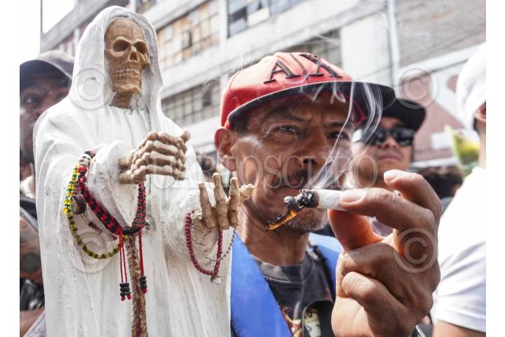 CIUDAD DE MÉXICO, 01NOVIEMBRE2022.- El barrio de Tepito registró una concurrencia de mujeres, niños, jóvenes y adultos mayores cuyo objetivo era llegar o acercarse lo más posible al altar de la Santa Muerte. Cada primero de noviembre cientos de devotos de la también llamada “Niña Blanca” acuden hasta uno de sus altares más populares en la Ciudad de México a visitarla y cumplir sus mandas, llevando ofrendas como alcohol o puros. Los cigarros o puros que se le ofrecen deberán estar encendidos colocados a un lado de ella. Se dice que cuando encienda un cigarro, uno es para uno es para uno mismo y el otro es para la Santa Muerte, esto ayudará a alejar la envidia en torno del trabajo y la familia. En caso de ofrendar un puro deberá encenderlo y fumarlo exhalando el humo directamente a la Santa Muerte, ya que ayudará a que se purifique el altar y se aleje toda energía negativa puede hacerlo las veces que lo crea conveniente. FOTO: ELIZABETH RUIZ/CUARTOSCURO.COM