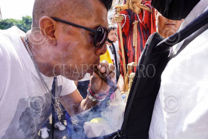 CIUDAD DE MÉXICO, 01NOVIEMBRE2022.- El barrio de Tepito registró una concurrencia de mujeres, niños, jóvenes y adultos mayores cuyo objetivo era llegar o acercarse lo más posible al altar de la Santa Muerte. Cada primero de noviembre cientos de devotos de la también llamada “Niña Blanca” acuden hasta uno de sus altares más populares en la Ciudad de México a visitarla y cumplir sus mandas, llevando ofrendas como alcohol o puros. Los cigarros o puros que se le ofrecen deberán estar encendidos colocados a un lado de ella. Se dice que cuando encienda un cigarro, uno es para uno es para uno mismo y el otro es para la Santa Muerte, esto ayudará a alejar la envidia en torno del trabajo y la familia. En caso de ofrendar un puro deberá encenderlo y fumarlo exhalando el humo directamente a la Santa Muerte, ya que ayudará a que se purifique el altar y se aleje toda energía negativa puede hacerlo las veces que lo crea conveniente. FOTO: ELIZABETH RUIZ/CUARTOSCURO.COM