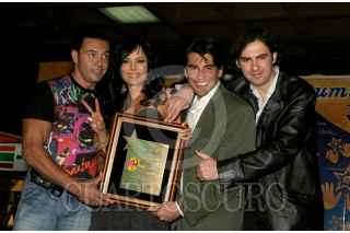 MÉXICO D.F. 23FEBRERO2007.- Los conductores del programa televisivo "Muevete" Latin Lover, Maribel Guardia, Mauricio Barcelata y el productor Roberto Romagnolly, muestran un reconocimiento otorgado en la plaza de las luminarias. FOTO: SAÚL LÓPEZ/CUARTOSCURO.COM