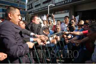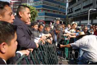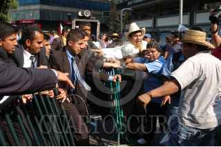 MÉXICO D.F. 23FEBRERO2007.- Manifestantes jaloenean las ballas de seguridad que mantenia el estado mayor presidencial a las afueras de un hotel en Av. Reforma donde el presidente asistiria a un vento con miebros del Club Rotario. FOTO: GUILLERMO PEREA/CUARTOSCURO.COM