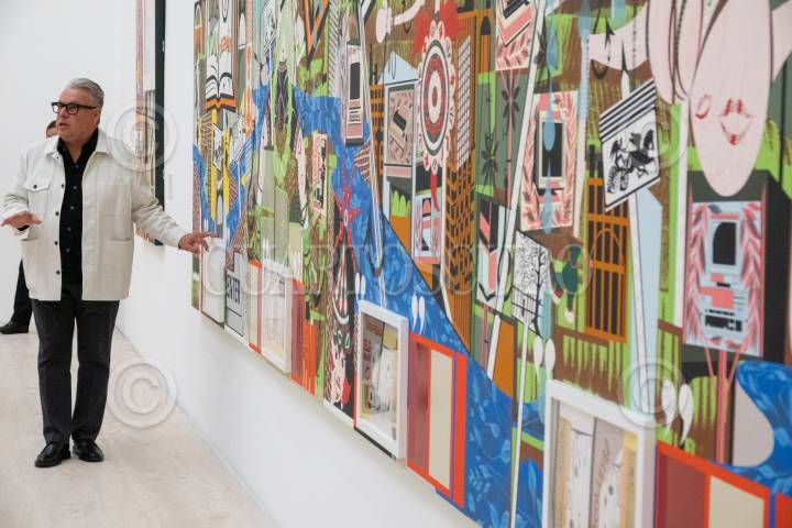 CIUDAD DE MÉXICO, 03NOVIEMBRE2022.- El artista colombo-estadounidense Lari Pittman inauguró su más reciente exposición “Lo que se ve, se pregunta” (título que retoma la icónica respuesta del intérprete Juan Gabriel tras ser cuestionado sobre su sexualidad). La muestra reúne más de 50 piezas entre pinturas, esculturas, dibujos, libros y guajes pintados que abordan los temas de la sexualidad, sociedades, así como la postura política de Pittman. Asimismo, las y los asistentes podrán contemplar la más reciente obra de Pittman titulada “Sparkling City With Egg Monuments” (Ciudad resplandeciente con monumentos de huevos) terminada en 2022 y siendo la primera vez expuesta. FOTO: GALO CAÑAS/CUARTOSCURO.COM