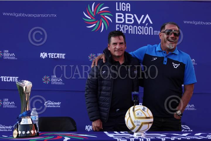CIUDAD DE MÉXICO, 08NOVIEMBRE2022.- Los directores técnicos Mario García y Paco Ramírez de los equipos de fútbol Atlante y Celaya, ofrecieron una conferencia de prensa en el Día de Medios e la que se mostró el balón y el trofeo que se llevará el equipo ganador en la Final de la Liga BBVA Expansión. El acto se realizó en el Estadio Ciudad de los Deportes. FOTO: GRACIELA LÓPEZ / CUARTOSCURO.COM
