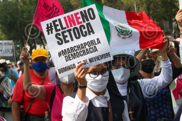 CIUDAD DE MÉXICO, 13NOVIEMBRE2022.- Ciudadanos marcharon en defensa del Instituto Nacional Electoral (INE) ante una posible reforma electoral impulsada por el gobierno federal. Los manifestantes partieron del Ángel de la Independencia rumbo al Monumento a la Revolución. Entre las personalidades que se observaron entre los contingentes están Santiago Creel, Héctor de Mauleón, y Claudio X González. La consigan principal fue "Yo vine a defender el INE", ante lo que ellos consideran como un atentado a la democracia. FOTO: MOISÉS PABLO/CUARTOSCURO.COM
