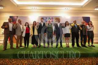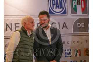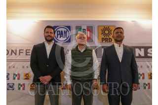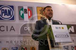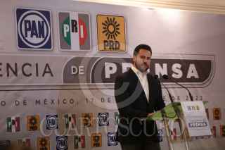 TOLUCA, ESTADO DE MÉXICO, 17NOVIEMBRE2022.- En conferencia de prensa Anuar Azar Figueroa, Erick Sevilla Montea de Oca y Agustín Barrera Soriano líderes estatales del PAN, PRI y PRD informaron que darán inicio a los trabajos de negociación para formalizar la coalición rumbo al proceso electoral 2023 en donde se elegirá gobernador en el Estado de México, conformando el bloque opositor a MORENA. FOTO: CRISANTA ESPINOSA AGUILAR /CUARTOSCURO.COM