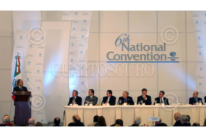MÉXICO, D.F., 27FEBRERO2007.- Simón Díaz, Presidente de American Chamber México le entregó un reconocimiento a Felipe Calderón Hinojosa, Presidente de la República, durante el desayuno que tuvo con sus integrantes en el marco de su 6ta Convención Nacional. FOTO: MOISÉS PABLO/CUARTOSCURO.COM