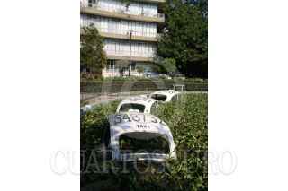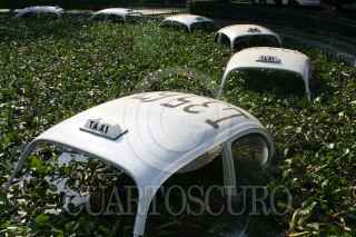 MÈXICO, D.F. 02MARZO2007.- Piezas de arte urbano estàn instaladas por la colonia Condesa como parte del proyecto "Usted Està Aquì"."No todo lo verde es ecològico" de Betsabeè Romero, instalaciòn que aborda la problemàtica de dos plagas verdes que invaden la ciudad: La urbana, los minitaxis y la natural: lirio que se extiende en Chapala, Xochimilco y Valle de Bravo. FOTO: PAOLA HIDALGO/CUARTOSCURO.COM