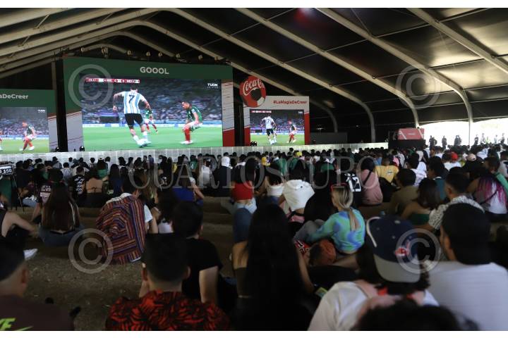 CIUDAD DE MÉXICO, 26NOVIEMBRE2022.- Aficionados observan el partido de la Selección Mexicana de fútbol, que participa en la copa del mundo en Qatar, en el primer día del festival de música urbana Flow Fest 2022 en el Autódromo Hermanos Rodríguez. FOTO: EDGAR NEGRETE/CUARTOSCURO.COM