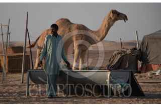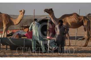 ABU DHABI, EMIRATOS ÁRABES UNIDOS, 29NOVIEMBRE2022.- “Cuarto Vacío” es la traducción de Rub-Al-Khali, el gran desierto con montañas de arena que se extiende en la zona interior de la mitad meridional de la Península Arábiga. A pesar de ser un lugar inhóspito, con temperaturas extremas, los turistas que llegan a Abu Dhabi, uno de los siete Emiratos Árabes Unidos más visitados además de Dubai, emprenden un viaje entre kilómetros de arena que se convierte en dunas. Migrantes provenientes principalmente de Omán, Yemen e India encontraron en este desierto una oportunidad de sustento y con camionetas 4x4 llevan a los curiosos por las enormes montañas de arena como si fueran en una montaña rusa, para luego mostrarles una granja de camellos y finalmente instalarlos en un campamento para esperar el atardecer de colores naranjas y rosados. FOTO: DENISSE HERNÁNDEZ/CUARTOSCURO.COM