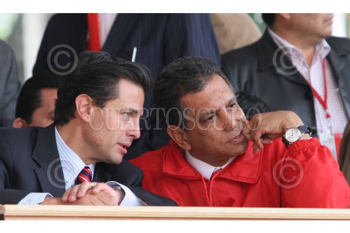 MEXICO, D.F. 04MARZO2007.- Enrique Peña Nieto, gobernador del Estado de México conversa con Fidel Herrera, gobernador de Veracruz durante la toma de protesta de la nueva dirigencia nacional del PRI. FOTO: NELLY SALAS/CUARTOSCURO.COM