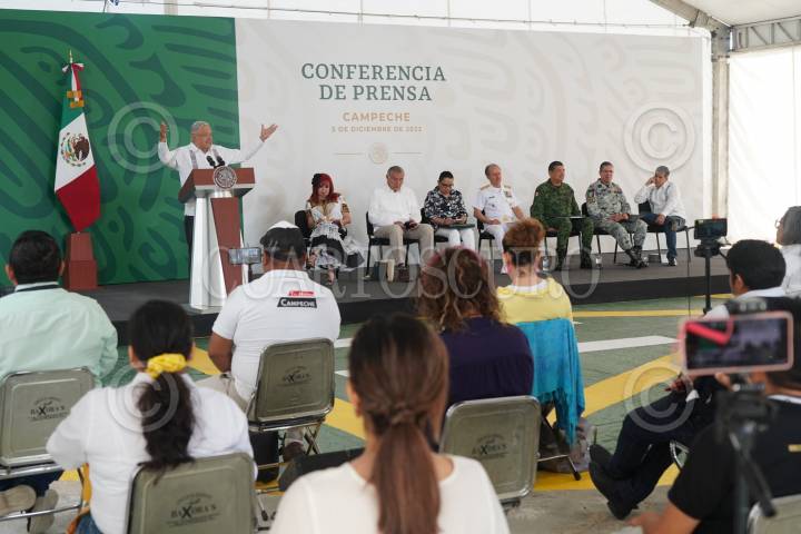 CAMPECHE, CAMPECHE, 05DICIEMBRE2022.- Andrés Manuel López Obrador, Presidente de los Estados Unidos Mexicanos ofreció su conferencia mañanera en Campeche. Lo acompañaron: Layda Sansores San Román, gobernadora de Campeche; Adán Augusto López Hernández, secretario de Gobernación; Rosa Icela Rodríguez Velázquez, secretaria de Seguridad y Protección Ciudadana; José Rafael Ojeda Durán, secretario de Marina; Luis Cresencio Sandoval González, secretario de la Defensa Nacional; Luis Rodríguez Bucio, comandante de la Guardia Nacional y Ricardo Sheffield Padilla, titular de la Procuraduría Federal del Consumidor (Profeco). FOTO: PRESIDENCIA/CUARTOSCURO.COM