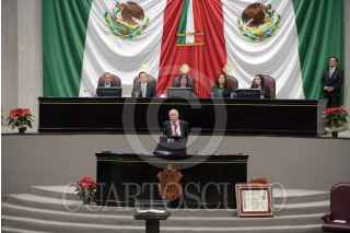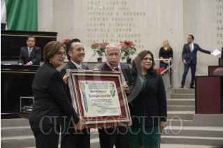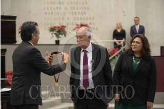 XALAPA, VERACRUZ, 05DICIEMBRE2022.- El gobernador Cuitláhuac García Jiménez entregó la medalla y diploma “Adolfo Ruiz Cortines” al académico y científico Manuel Ángel Gómez Cruz por su labor de investigación y aportaciones a la agricultura orgánica. La ceremonia se llevó a cabo en el pleno de sesiones del Congreso del Estado. También acompañaron la fiscal general del Estado, Verónica Hernández Giadáns; el secretario de Gobierno Eric Cisneros Burgos, así como la nueva magistrada presidenta del Poder Judicial, Lisbeth Jiménez Aguirre. FOTO: YERANIA ROLÓN/CUARTOSCURO.COM