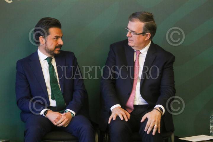 CIUDAD DE MÉXICO, 06DICIEMBRE2022.- Marcelo Ebrard, secretario de Relaciones Exteriores; Roberto Velasco, Jefe de la Unidad para América del Norte de la SRE; y Juan Sabines, cónsul de México en Orlando, encabezaron la firma de convenio entre la SRE y el IMSS, que les permitirá a los paisanos en Estados Unidos incorporarse al Seguro Social y asegurar a sus allegados en México. FOTO: MOISÉS PABLO/CUARTOSCURO.COM