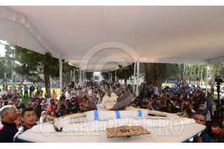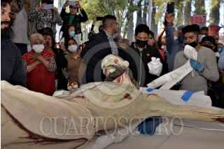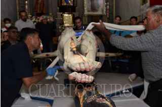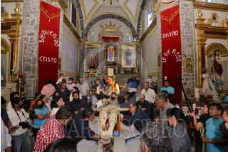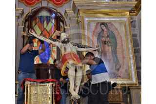 ECATEPEC, ESTADO DE MÉXICO, 06DICIEMBRE2022.- Música de mariachi y cohetones anunciaron por lo alto la llegada del Cristo Divino Redentor a Santo Tomás Chiconautla, el cual se ausentó de su comunidad para recibir tratamientos de conservación y restauración, luego de una mala intervención que lastimó severamente su capa pictórica. La Secretaría de Cultura del Gobierno de México, a través del Instituto Nacional de Antropología e Historia (INAH), hizo entrega a la feligresía de Chiconautla de esta escultura del siglo XVII, cuya junta vecinal fue asidua visitante a los talleres de restauración de la Coordinación Nacional de Conservación del Patrimonio Cultural (CNCPC), en la Ciudad de México, durante los tres años y nueve meses que permaneció ahí. En representación de la titular de la CNCPC, María del Carmen Castro Barrera, la restauradora María Cristina Noguera Reyes agradeció la confianza depositada en el equipo de especialistas del Laboratorio de Escultura Policromada, que estuvo a cargo de su restauración y logró lo aparentemente imposible: su recuperación estética. FOTO: INAH/CUARTOSCURO.COM