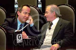 Felipe Calderon conversa con su compañero de bancada Luis Pazos durante la sesión de la Cámara de Diputados. FOTO: Victoria Valtierra/CUARTOSCURO.COM