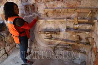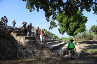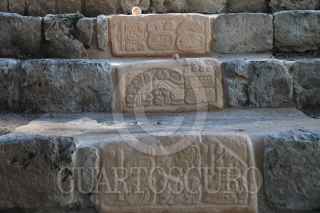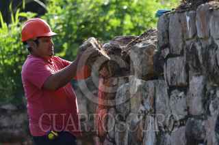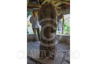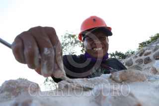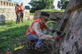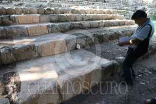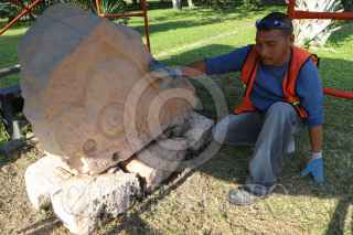OXKINTOK, MAXCANÚ, YUCATÁN 07DICIEMBRE2022.- La zona arqueológica de Oxkintok se localiza en la región más occidental del Puuc, a 70 kilómetros al sur de la ciudad de Mérida. En días pasados trabajadores pertenecientes al Instituto Nacional de Antropología e Historia, INAH, hallaron una peculiar escultura dual que representa al dios maya del culto fálico "Yum Keep", el cual permitía en el Mayab la fertilidad y el concepto real de la vida, así lo dio a conocer el Arqueólogo encargado del proyecto Luis R. Pantoja Díaz. De igual manera se realizan trabajos de restauración en las escalinatas del sitio en dónde fueron encontradas algunas piedras con jeroglíficos esculpidos. FOTO: MARTIN ZETINA/CUARTOSCURO.COM