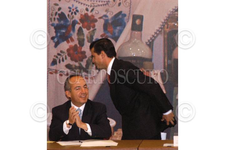 MÉXICO D.F. 05MARZO2007.- El presidente Felipe Calderón Hinojosa acompañado de Enrique Peña Nieto gobernador del Estado de México y Eduardo Sojo Garza-Aldape secretario de economía, durante la firma del convenio ¨Sistema de Apertura Rapida de Empresas¨en la residencia oficial de los Pinos. FOTO: GUILLERMO PEREA/CUARTOSCURO.COM