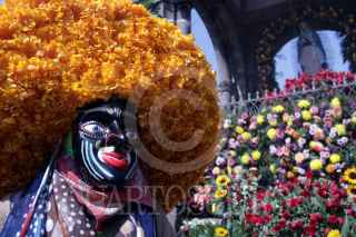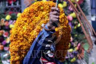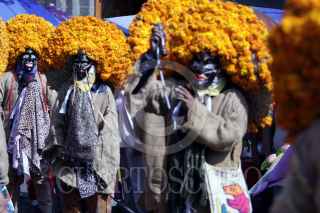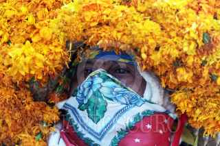 CUERNAVACA, MORELOS, 12 DICIEMBRE 2022.- Un grupo de danza de los Tlacololeros del vecino estado de Guerrero llego al chapitel del Calvario para celebrar la conmemoración numero 491 de la aparición de la Virgen de Guadalupe al indígena Juan Diego en el cerro del Tepeyac. Esta danza que tiene su origen en la región centro del estado de Guerrero y que se practica desde hace mas de 200 años, representa el esfuerzo que hacen los campesinos para sacar adelante sus cosechas, los atavíos que usan son muy coloridos, destacándose un sombrero hecho con decenas de flores amarillas de cempasúchil y una mascara de color oscuro. FOTO: MARGARITO PÉREZ RETANA / CUARTOSCURO.COM