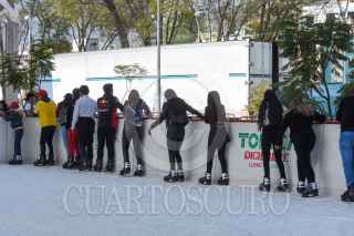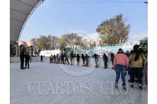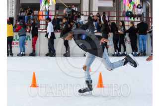 TOLUCA, ESTADO DE MÉXICO, 13DICIEMBRE2022.- Jóvenes disfrutan de la pista de hielo instalada en la explanada del Teatro Morelos, como parte de los festejos decembrinos en el municipio de Toluca. FOTO: CRISANTA ESPINOSA AGUILAR /CUARTOSCURO.COM
