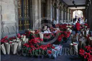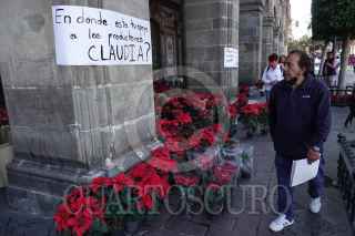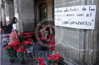 CIUDAD DE MÉXICO, 14DICIEMBRE2022.- Productores de San Luis Tlaxialtemalco, alcaldía Xochimilco, se manifestaron afuera del Palacio del Ayuntamiento en donde dejaron cientos de flores de noche buena para exigir una indemnización total debido a que no pudieron vender las flores debido a los bloqueos ocasionados en San Gregorio hace unos días. FOTO: GRACIELA LÓPEZ /CUARTOSCURO.COM