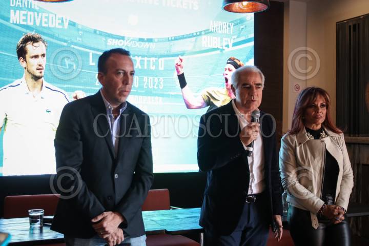 CIUDAD DE MÉXICO, 15DICIEMBRE2022.- José Escalante, Eduardo Rodríguez, Diana Vanoni ofrecieron conferencia para hablar de el Tennis ShowDown con Andrey Rublev y Daniel Medvedev el 20 de marzo de 2023. La conferencia se llevó a cabo en el Frontón México. FOTO: ANDREA MURCIA /CUARTOSCURO.COM