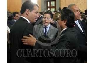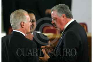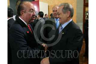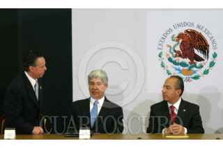 MÉXICO, D.F., 09MARZO2007.- Jose Elías Romero Apis y Olegario Vázque Raña, durante el evento Justicia Penal y Seguridad Pública evento en donde se firmo la iniciativa de ley en materia de procuración de justicia en la residencia de los Pinos. FOTO. MOISÉS PABLO/CUARTOSCURO.COM