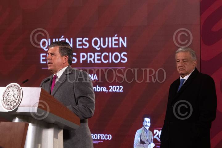 CIUDAD DE MÉXICO, 19DICIEMBRE2022.- Andrés Manuel López Obrador, Presidente de México, y Ricardo Sheffield Padilla, titular de Profeco, durante la mañanera, en la cual hablaron sobre el tema de Ticketmaster, el atentado a Curi Gómez Leyva y la continuidad de las mañaneras. FOTO: MOISÉS PABLO/CUARTOSCURO.COM