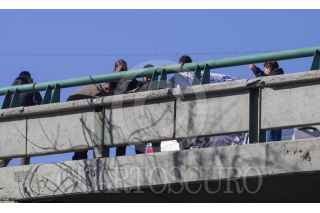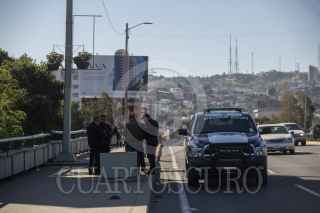 TIJUANA BAJA CALIFORNIA,19DICIEMBRE2022.- Personas que hacían fila para cruzar hacía Estados Unidos atestiguaron como un grupo de varios hombres colgaron de los puentes principales de Vía Rápida Oriente de Zona Río varias mantas con amenazas a la Policía Municipal, lo que originó un fuerte dispositivo en la Zona Río para intentar detener a los responsables. FOTO: OMAR MARTÍNEZ/ CUARTOSCURO.COM