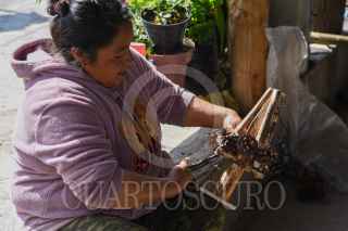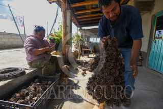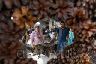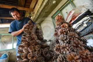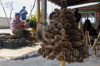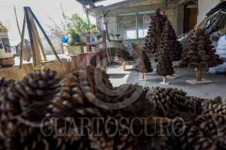XONACATLÁN, ESTADO DE MÉXICO, 23DICIEMBRE2022.- La Familia Pérez del barrio la Cumbre en la Comunidad de San Miguel Mimiapan en el municipio de Xonacatlán desde hace 13 años se dedican a elaborar árboles de navidad y coronas con piñas de pino, en el mes de marzo juntan las piñas parte importante para elaborar los árboles así como las varas y en octubre empiezan a armarlos y tenerlos listos para los festejos navideños. Los tamaños que manejan van desde los 35 cm hasta 1 metro de altura, su árboles han llegado a distintos puntos de la República Mexicana e invitan a la población a adquirir lo echo por los artesanos. FOTO: CRISANTA ESPINOSA AGUILAR /CUARTOSCURO.COM