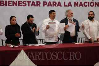 OAXACA, OAXACA, 23DICIEMBRE2022.- El gobernador de Oaxaca Salomón Jara Cruz y el subsecretario de Derechos Humanos, Población y Migración, Alejandro Encinas Rodríguez, encabezaron la instalación de la mesa de construcción de paz con justicia y bienestar para la Nación Triqui. Los funcionarios se reunieron con integrantes del Movimiento de Unificación y Lucha Triqui (MULT), Movimiento de Unificación y Lucha Triqui Independiente (MULTI) y la Unión de Bienestar Social de la Región Triqui (UBISORT), tres de las organizaciones con presencia en la zona. FOTO: CAROLINA JIMÉNEZ/CUARTOSCURO.COM