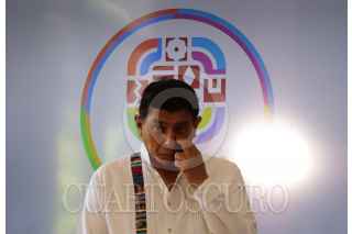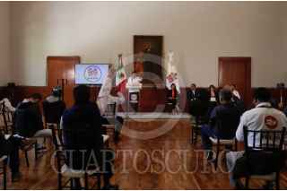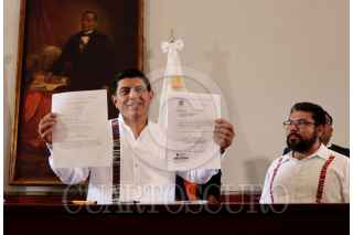 OAXACA, OAXACA, 27DICIEMBRE2022.- El gobernador de Oaxaca, Salomón Jara Cruz, realizó este martes su conferencia matutina semanal en el Palacio de Gobierno. El ejecutivo estatal habló sobre el presupuesto de egresos 2023 en el que fueron aprobados 92 mil millones de pesos, además dijo que en la elección del nuevo fiscal general del estado, no tendrá injerencia y se apegará a la ley. Al término de la conferencia firmó la sanción y promulgación de la reforma constitucional en materia de Revocación de Mandato, iniciativa enviada por él al Congreso local y que fue aprobada. FOTO: CAROLINA JIMÉNEZ/CUARTOSCURO.COM
