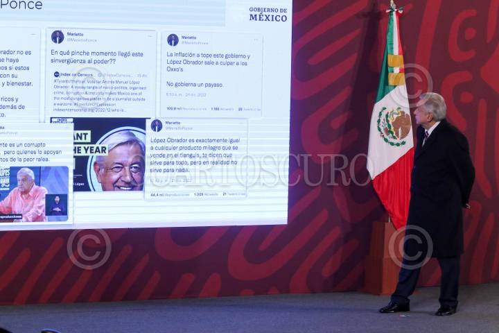 CIUDAD DE MÉXICO, 28DICIEMBRE2022.- Andrés Manuel López Obrador, Presidente de México, y Ana Elizabeth García Vilchis, durante la mañanera en la cual se presentaron el recuento de las mentiras del año en los medios de comunicación. FOTO: MOISÉS PABLO/CUARTOSCURO.COM