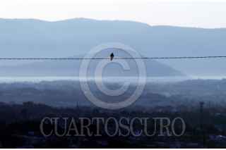 CUERNAVACA, MORELOS, 01ENERO2023- Un ave se sostiene en un cable durante el amanecer de este día, al fondo se observa la contaminación que dejo la quema de cohetes durante las celebraciones de fin de año. FOTO: MARGARITO PÉREZ RETANA / CUARTOSCURO.COM