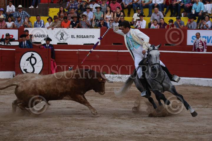 MÉRIDA, YUCATÁN, 01ENERO2023.- Esta tarde se llevó a cabo la primera corrida de Rejones de la temporada 2023 en la Monumental Plaza de Toros Mérida que lució casi llena. Con toros de Enrique Fraga de presencia y juego variado con pesos de entre 460 y 490 kilos el triunfador de la tarde fue Fauro Aloi quién cortó una oreja en su primer toro. La suerte no fue igual para los rejoneadores Joao Ribeiro y Tarik Othón quienes pasaron inéditos dejando interesantes pinceladas ecuestres para el público. Destaca la participación de los forjados portugueses de A Posento Da Chamusca quienes se vieron en aprietos tras varias revolcadas con el astado. FOTO: MARTIN ZETINA/CUARTOSCURO.COM