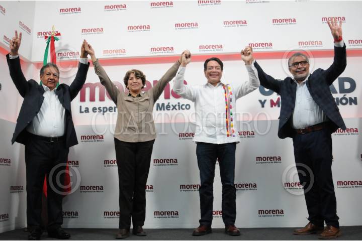 CIUDAD DE MÉXICO, 04ENERO2023.- Delfina Gómez, candidata única de Morena a la gobernatura del Estado de México, presentó en conferencia de prensa a Higinio Martínez como delegado especial para el proceso electoral y a Horacio Duarte como coordinador de su pre campaña y campaña rumbo a las elecciones en 2023. FOTO: DANIEL AUGUSTO /CUARTOSCURO.COM