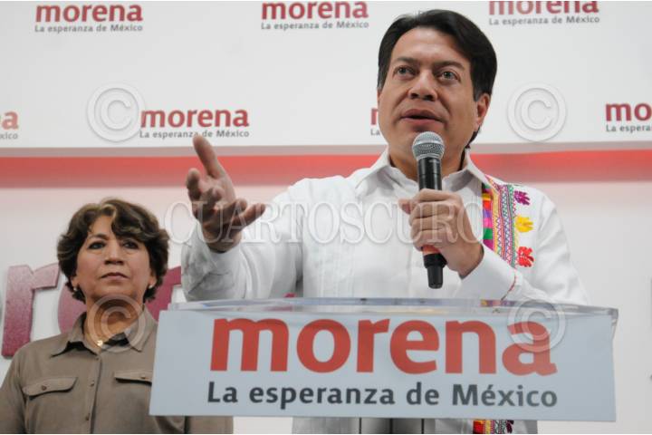 CIUDAD DE MÉXICO, 04ENERO2023.- Delfina Gómez, candidata única de Morena a la gobernatura del Estado de México, presentó en conferencia de prensa a Higinio Martínez como delegado especial para el proceso electoral y a Horacio Duarte como coordinador de su pre campaña y campaña rumbo a las elecciones en 2023. FOTO: DANIEL AUGUSTO /CUARTOSCURO.COM