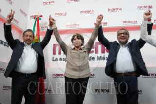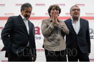 CIUDAD DE MÉXICO, 04ENERO2023.- Delfina Gómez, candidata única de Morena a la gobernatura del Estado de México, presentó en conferencia de prensa a Higinio Martínez como delegado especial para el proceso electoral y a Horacio Duarte como coordinador de su pre campaña y campaña rumbo a las elecciones en 2023. FOTO: DANIEL AUGUSTO /CUARTOSCURO.COM