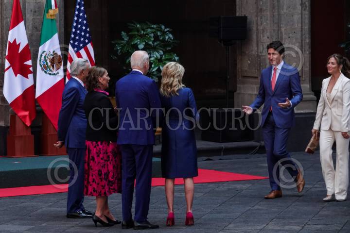CIUDAD DE MÉXICO, 10ENERO2023.- Andrés Manuel López Obrador, presidente de México, y Beatriz Gutiérrez Müller, investigadora y primera dama, encabezaron el recibimiento de los presidentes Joe Biden (EEUU) y Justin Trudeau (Canadá) junto con las primeras damas Jill Biden y Sophie Grégoire Trudeau en Palacio Nacional de cara a la Cumbre de Líderes de América del Norte. FOTO: GALO CAÑAS/CUARTOSCURO.COM