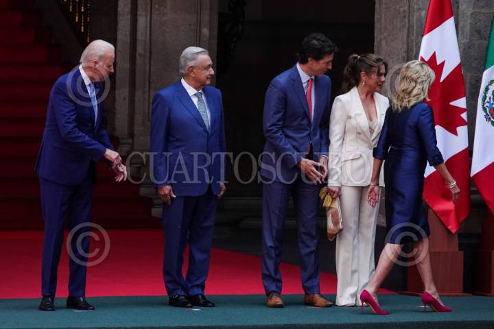 CIUDAD DE MÉXICO, 10ENERO2023.- Andrés Manuel López Obrador, presidente de México, y Beatriz Gutiérrez Müller, investigadora y primera dama, encabezaron el recibimiento de los presidentes Joe Biden (EEUU) y Justin Trudeau (Canadá) junto con las primeras damas Jill Biden y Sophie Grégoire Trudeau en Palacio Nacional de cara a la Cumbre de Líderes de América del Norte. FOTO: GALO CAÑAS/CUARTOSCURO.COM