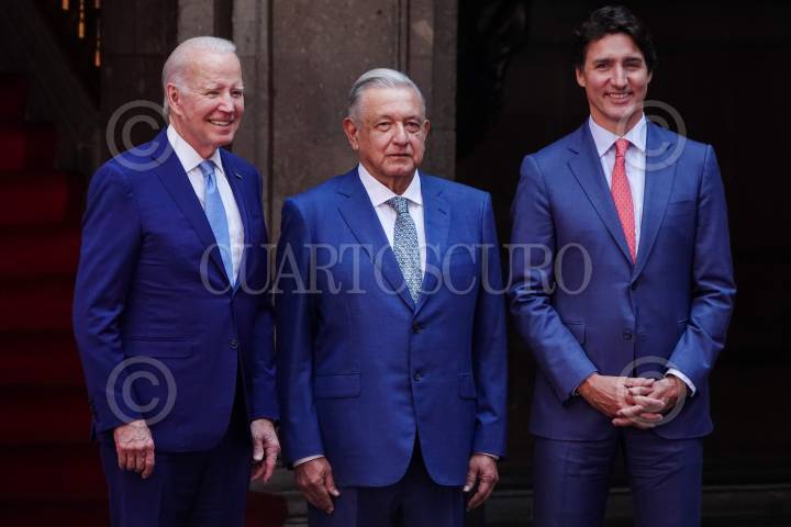 CIUDAD DE MÉXICO, 10ENERO2023.- Andrés Manuel López Obrador, presidente de México, y Beatriz Gutiérrez Müller, investigadora y primera dama, encabezaron el recibimiento de los presidentes Joe Biden (EEUU) y Justin Trudeau (Canadá) junto con las primeras damas Jill Biden y Sophie Grégoire Trudeau en Palacio Nacional de cara a la Cumbre de Líderes de América del Norte. FOTO: GALO CAÑAS/CUARTOSCURO.COM