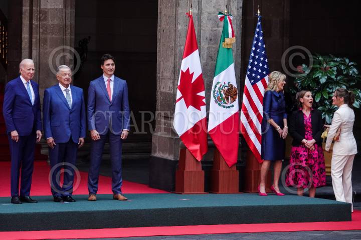 CIUDAD DE MÉXICO, 10ENERO2023.- Andrés Manuel López Obrador, presidente de México, y Beatriz Gutiérrez Müller, investigadora y primera dama, encabezaron el recibimiento de los presidentes Joe Biden (EEUU) y Justin Trudeau (Canadá) junto con las primeras damas Jill Biden y Sophie Grégoire Trudeau en Palacio Nacional de cara a la Cumbre de Líderes de América del Norte. FOTO: GALO CAÑAS/CUARTOSCURO.COM