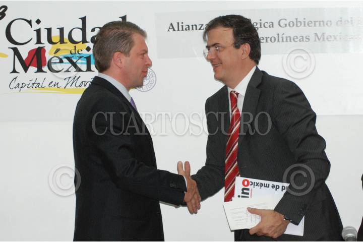 MÉXICO D.F. 12MARZO2007.- Marcelo Ebrard, jefé de gobierno del Distrito Federal, y Lic. Alejandra Barrales secretaria de turismo del Distrito Federal, durante la conferencia de prensa para informar la alianza estrátediga entre el GDF y las aerolínea mexicanas. FOTO: CLAUDIA ARÉCHIGA/CUARTOSCURO.COM