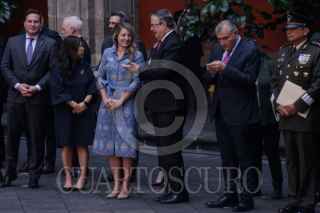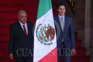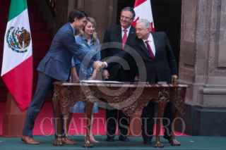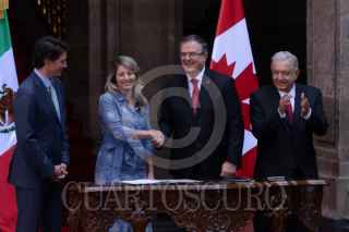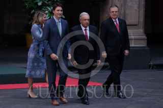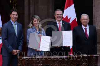 CIUDAD DE MÉXICO, 11ENERO2023.- Andrés Manuel López Obrador, presidente de México; Justin Pierre James Trudeau, primer ministro de Canadá; Marcelo Ebrard, secretario de Relaciones Exteriores, y Mélanie Joly Ministra de Asuntos Exteriores de Canadá, encabezaron la firma del Memorándum de entendimiento entre el Instituto Nacional de Pueblos Indígenas (INPI) y Crow Indigenous Relations and Northern Affairs Canadá (CIRNAC), realizado en el Patio de Honor de Palacio Nacional. FOTO: MARIO JASSO/CUARTOSCURO.COM