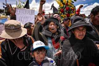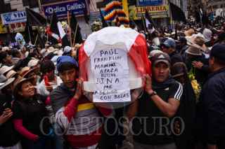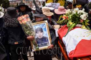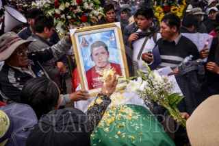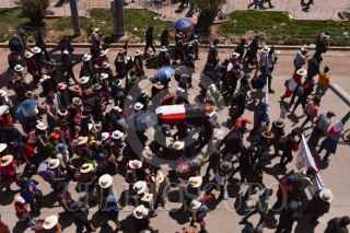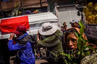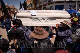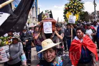 PUNO, PERÓ, 11ENERO2023.- A modo de cortejo fúnebre, 17 fallecidos del pasado lunes recorrieron en féretro las calles de la ciudad de Juliaca. Partiendo de la morgue ubicada en el Hospital Carlos Monge Medrano, la primera parada fue la Plaza de Armas, frente a la Iglesia "Matriz de Santa Catalina", donde se celebró una misa con los 17 ataúdes dispuestos frente a la catedral. Después del rito religioso, la multitud se dirigió con sus muertos a hombros hacia las inmediaciones del Aeropuerto Internacional Inca Manco Cápac, zona donde se han registrado los pasados enfrentamientos entre elementos de la Policía Nacional y los pobladores, zona también donde los diecisiete que moraban dentro de las cajas de madera, perdieron la vida resultado de dichos enfrentamientos. FOTO: PEDRO ANZA /CUARTOSCURO.COM