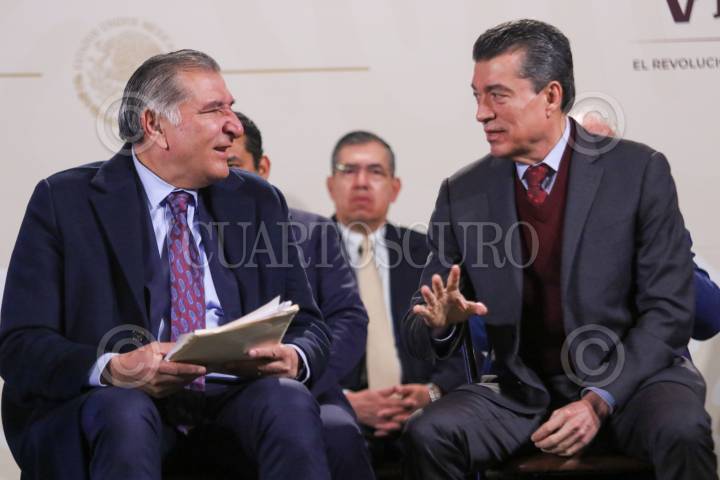 CIUDAD DE MÉXICO, 16ENERO2023.- Andrés Manuel López Obrador, Presidente de México; Adán Augusto López Hernández, secretario de Gobernación; Rutilio Escandón Cadenas, gobernador del estado de Chiapas; Carlos Manuel Merino gobernador del estado de Tabasco; Luis Cresencio Sandoval Gónzalez, secretario de la Defensa Nacional; Ariadna Montiel Reyes, secretaria de Bienestar; María Estela Ríos Gónzalez, Consejera Jurídica de la Presidencia de la República; Ricardo Sheffield Padilla, titular de la Procuraduría Federal del Consumidor (Profeco); Javier May Rodríguez, director general del Fondo Nacional de Fomento al Turismo (Fonstur); Diego Prieto Hernández, director general del Instituto Nacional de Antropología e Historia (INAH); Mayte Ramos Gómez, directora de Alstom México; Kosovar Pedro Pereira, Mota-Engil! Blas Andrés Núñez Jordán, jefe del Centro Coordinador de Operaciones (CCO) del Tren Maya; Luis Rodríguez Bucio, subsecretario de Seguridad Pública de la Secretaría de Seguridad y Protección Ciudadana (SSPC), y David Cordova Campos, Comandante de la Guardia Nacional, durante la mañanera, en la que se habló de los avances del Tramo 1 del Tren Maya, y del caso de la ministra Yasmín Esquivel. FOTO: MOISÉS PABLO/CUARTOSCURO.COM