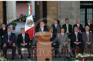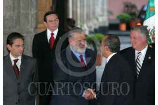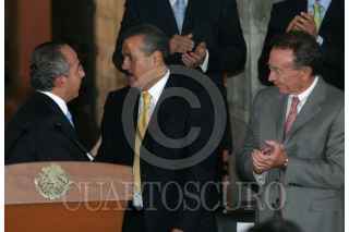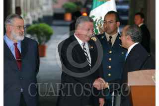 MÉXICO, D.F., 15MARZO2007.- Felipe Calderón Hinojosa, Presidente de la República saluda Manlio Fabio Beltrones, Presidente de la Mesa Directiva de la Cámara de Senadores, durante la presentación de su balance de inicio de gobierno acompañado de su gabinete en el Palacio Nacional. A la derecha los observa Guillermo Ortiz, Gobernador del Banco de México. FOTO: MOISÉS PABLO/CUARTOSCURO.COM