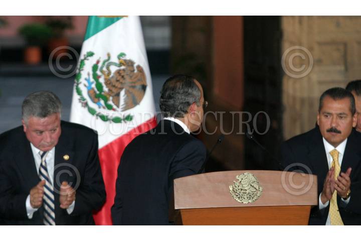 MÉXICO, D.F., 15MARZO2007.- Felipe Calderón Hinojosa, Presidente de la República, presentó su balance de inicio de gobierno acompañado de su gabinete en el Palacio Nacional. En la imagen lo flanquean los presidentes de las cámaras legislativas, Jorge Zermeño y Manlio Fabio Beltrones. FOTO: MOISÉS PABLO/CUARTOSCURO.COM