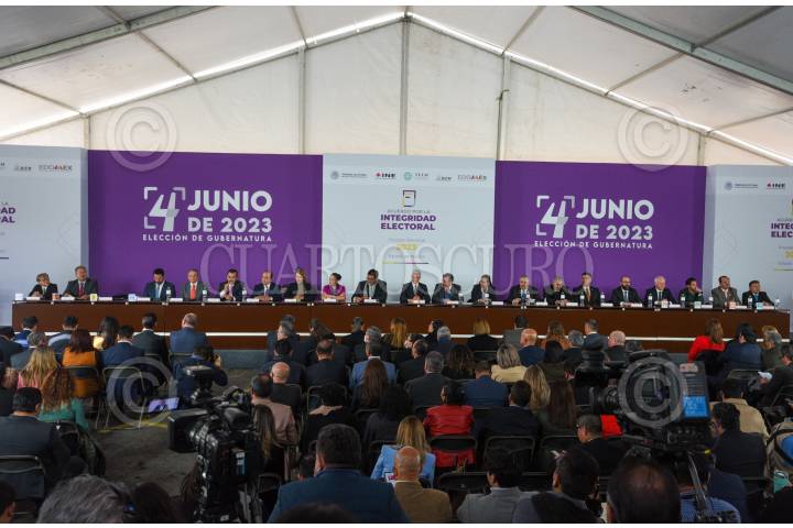 TOLUCA, ESTADO DE MÉXICO, 19ENERO2023.- Alfredo del Mazo Maza, gobernador del Estado de México, Reyes Rodríguez Mondragón , Magistrado Presidente de la Sala Superior del Tribunal Electoral del Poder Judicial de la Federación, Lorenzo Córdova Vianello Consejero Presidente del Consejo General del Instituto Nacional Electoral (INE), Amalia Pulido Gómez, Consejera Presidenta del IEEM, Leticia Victoria Tavira, Magistrada Presidenta del TEEM, firmaron el Acuerdo por la Integridad del Proceso Electoral Estatal 2023 en el Estado de México. FOTO: CRISANTA ESPINOSA AGUILAR /CUARTOSCURO.COM