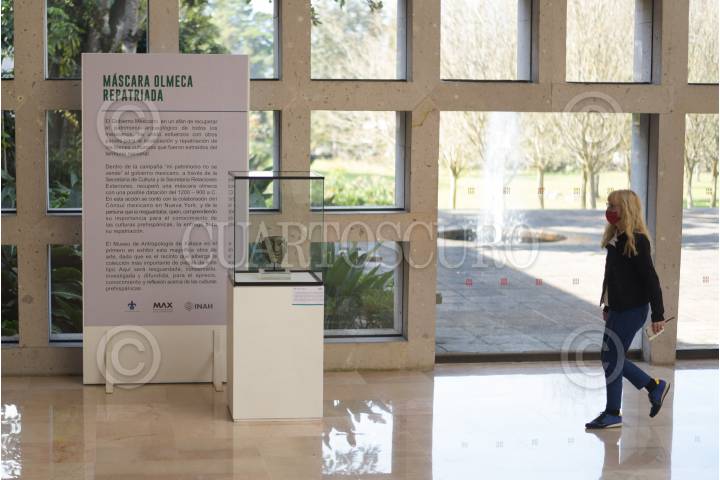 XALAPA, VERACRUZ, 19ENERO2023.- Una máscara olmeca que data entre el año 1200 y 900 a.C. es exhibida en el Museo de Antropología de Xalapa luego de haber sido recuperada de un coleccionista en Nueva York y repatriada a México. FOTO: YERANIA ROLÓN/CUARTOSCURO.COM