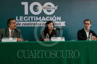 CIUDAD DE MÉXICO, 20ENERO2023.- Luisa María Alcalde, secretaria del Trabajo y Previsión Social (STPS), en compañía de Alfredo Domínguez Marrufo, director general del Centro Federal de Conciliación y Registro Laboral, y Esteban Martínez, itular de la Unidad de Enlace para la Reforma al Sistema de Justicia Laboral (UERSJL), encabezaron la conferencia de prensa para anunciar que aún quedan 100 días para la Legitimación de Contratos Colectivos para los sindicatos. Alcalde Luján llamó a que las organizaciones sindicales realicen las votaciones correspondientes para la aceptación o negación de los contratos planteados, a fin de poder registrarlos y tener el respaldo de la dependencia. FOTO: GALO CAÑAS/CUARTOSCURO.COM