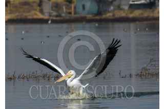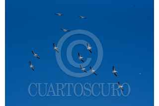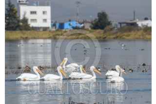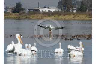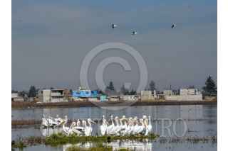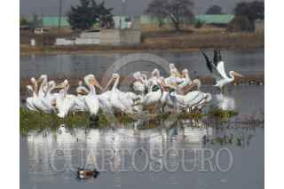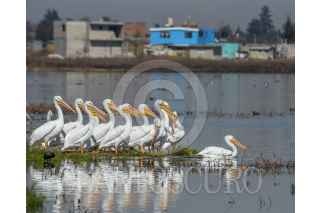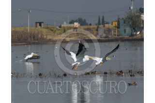 TOLUCA, ESTADO DE MÉXICO, 20ENERO2023.- Un grupo de Pelícanos blancos americanos se encuentran en el bordo de Palmillas en San Pablo Autopán, por segundo año estas aves migraron a cuerpos de agua del Valle de Toluca, arribado primero al bordo de San Jerónimo en Tlachaloya. FOTO: CRISANTA ESPINOSA AGUILAR /CUARTOSCURO.COM